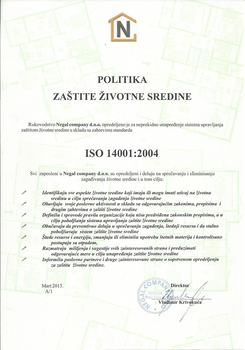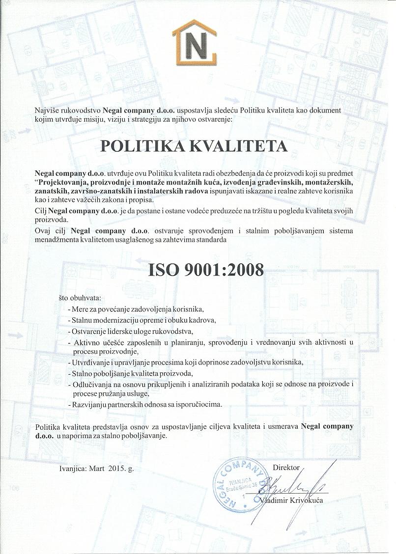 Negal company d.o.o. u samom procesu proizvodnje energetski-efikasnih montažnih kuća od bioloških materijala najveću pažnju poklanja kontroli kvaliteta i očuvanju prirodne sredine. Uvedeni sistem kvaliteta ISO 9001:2015, ISO 18001:2007 i ISO 14001:2015 garantuje visok kvalitet izgradnje montažnog objekta, da se u toku izgradnje vodilo računa da se isključivo koriste prirodni ekološki materijali koji ne zagađuju prirodnu sredinu i koji nemaju bilo kakvog štetnog uticaja na ljudsko zravlje i da se prilikom rada primenjuju sve mere bezbednosti i zdravlja na radu.