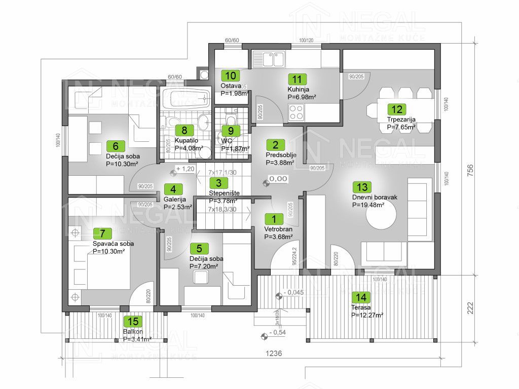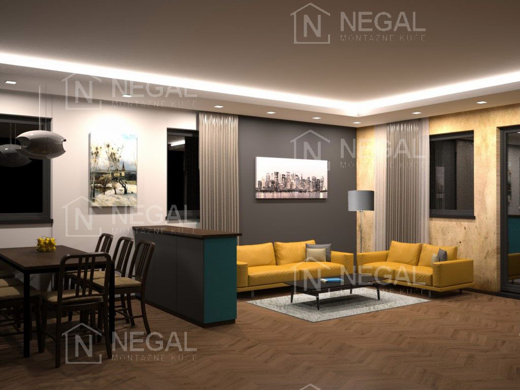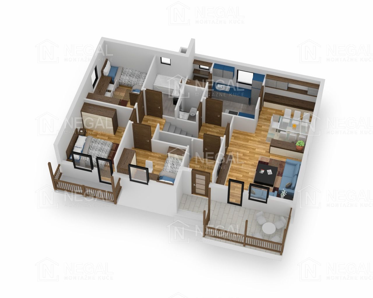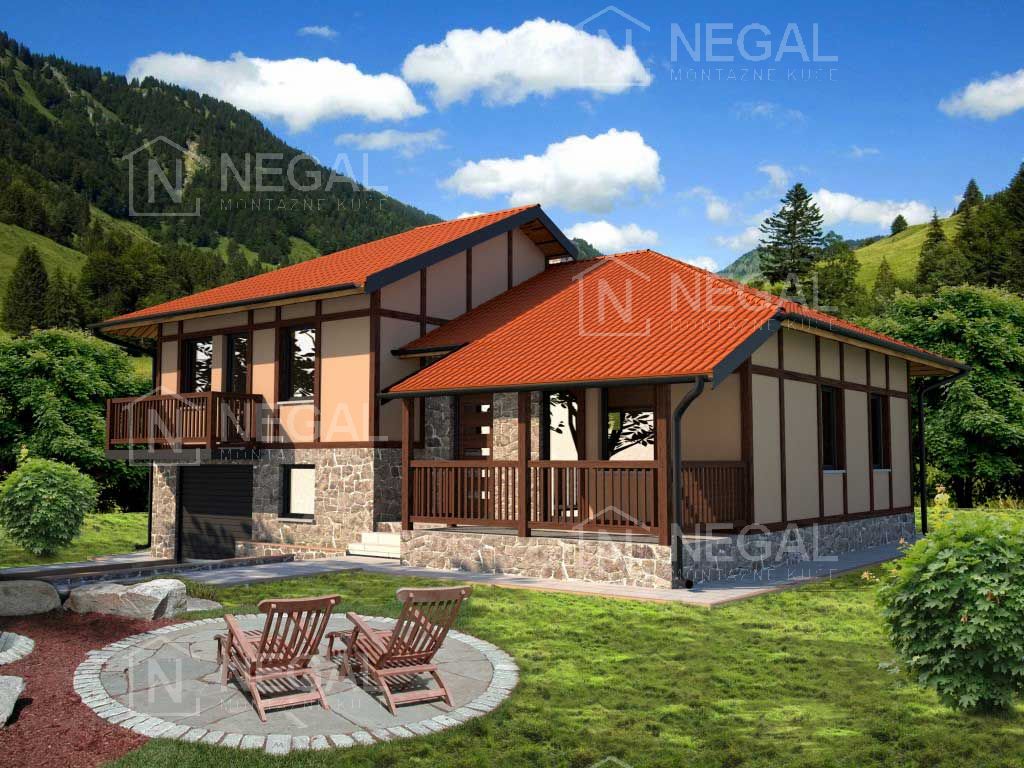 Montažna NEGAL stambena kuća iz kategorije Klasik. Komforna porodična kuća za porodice sa troje ili četvoro dece. Odlična kompozicija prostorija koje su podeljene u dve veoma funkcionalne celine. Jedna celina koja je denivelacijom podignuta u odnosu na drugu za sedam stepenika čini tri veoma komforne sobe i komfornim kupatilom. Međusobnu komunikaciju ostvaruju preko hodnika koji je samom organizacijom prostora sveden na minimum. Jedna soba koja ima pogled na prednji deo kuće ima direktan izlaz na balkon preko balkonskih vrata. Drugu celinu čini prostran dnevni boravak sa trpezarijom. Ima direktan izlaz na komfornu terasu koja sa ulaznim tremom čini jednu celinu. Kuhinja je fizički odvojena od dnevnog boravka i poseduje ostavinski prostor za odlaganje kuhinjskog inventara. U ovoj celini se nalazi i zaseban WC. Sobe se nalaze iznad garaže pored koje postoje i podrumske prostorije za odlaganje baštenskog alata i prateće opreme Vašeg automobila. Ostvaren je i direktan pristup iz garaže do unutrašnjeg dela kuće preko stepeništa.