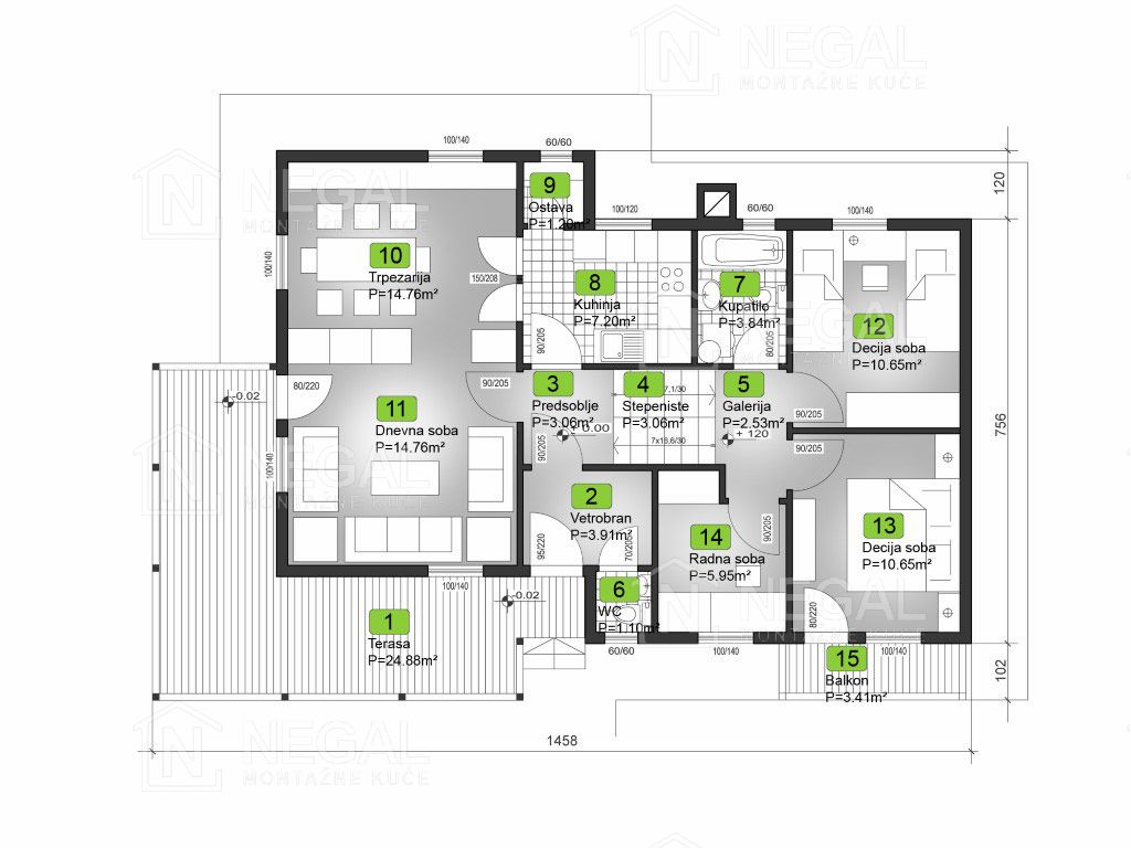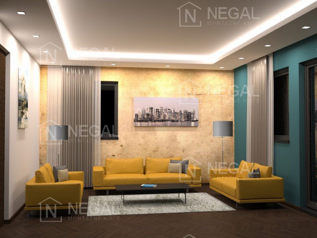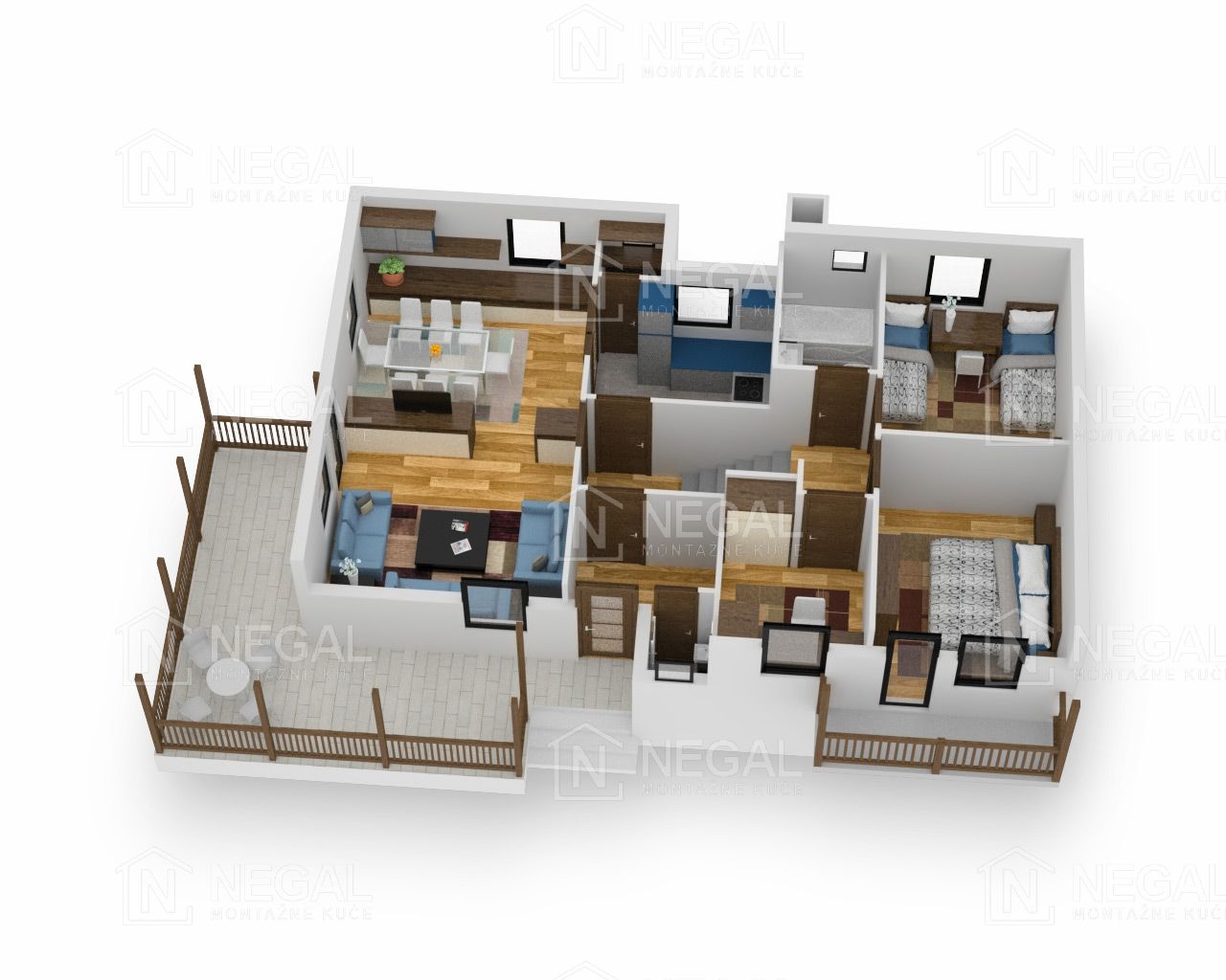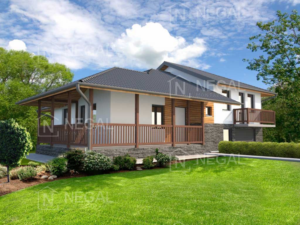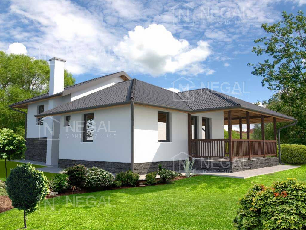 Montažna NEGAL stambena kuća iz kategorije Klasik. Dimenzije su 14.58 m x 9.78 m. Moderna i savremena kuća za udoban i komforan život četvoročlane ili petočlane porodice. Atraktivnog spoljnjeg izleda gde posebnu eleganciju i toplinu daje drvo na fasadi. Savremeni izolacioni materijali kuću čine energetski efikasnom i obezbeđuju udoban boravak kako leti tako i zimi. Poseduje dve denivelisane celine. Ispod višeg dela postoji garaža sa podrumskim prostorijama. Garaža je opremljena garažnim segmentnim vratima koja se pokreću sa elektromotorima i upravljana daljinskim upravljačem za potpuni komfor prilikom parkiranja.