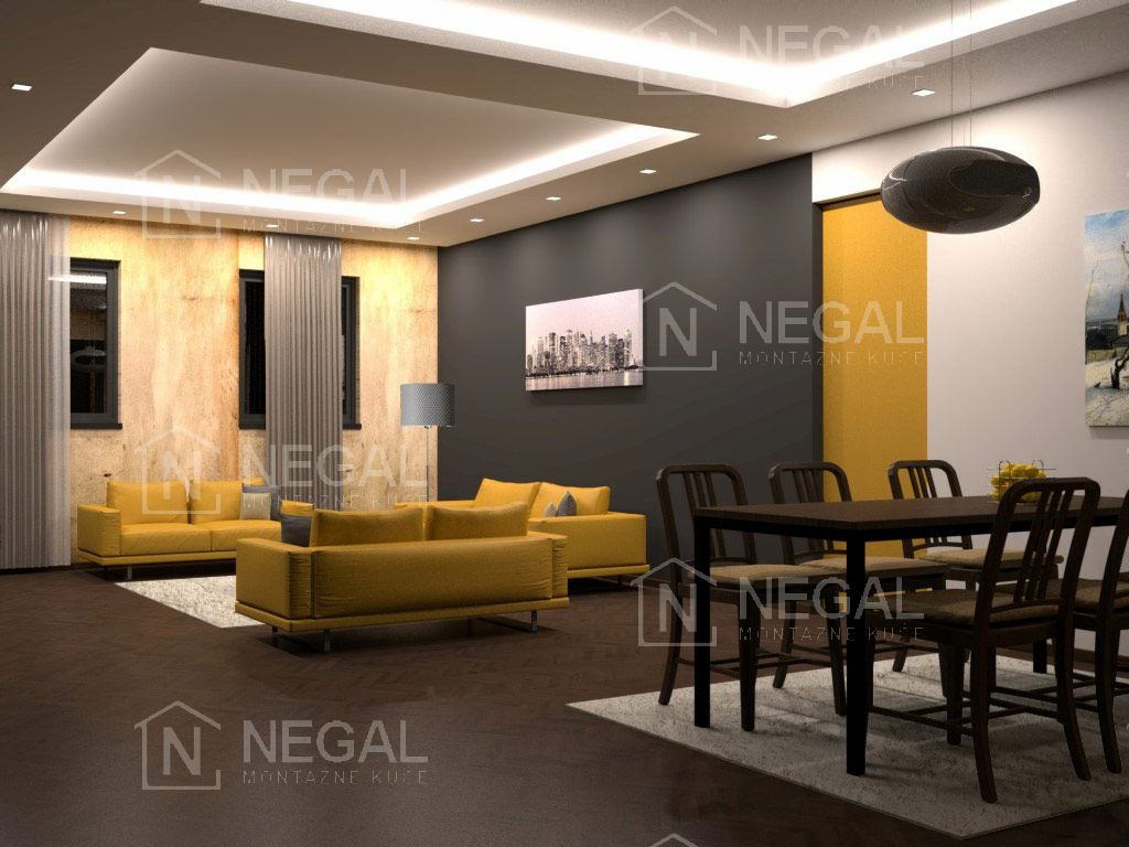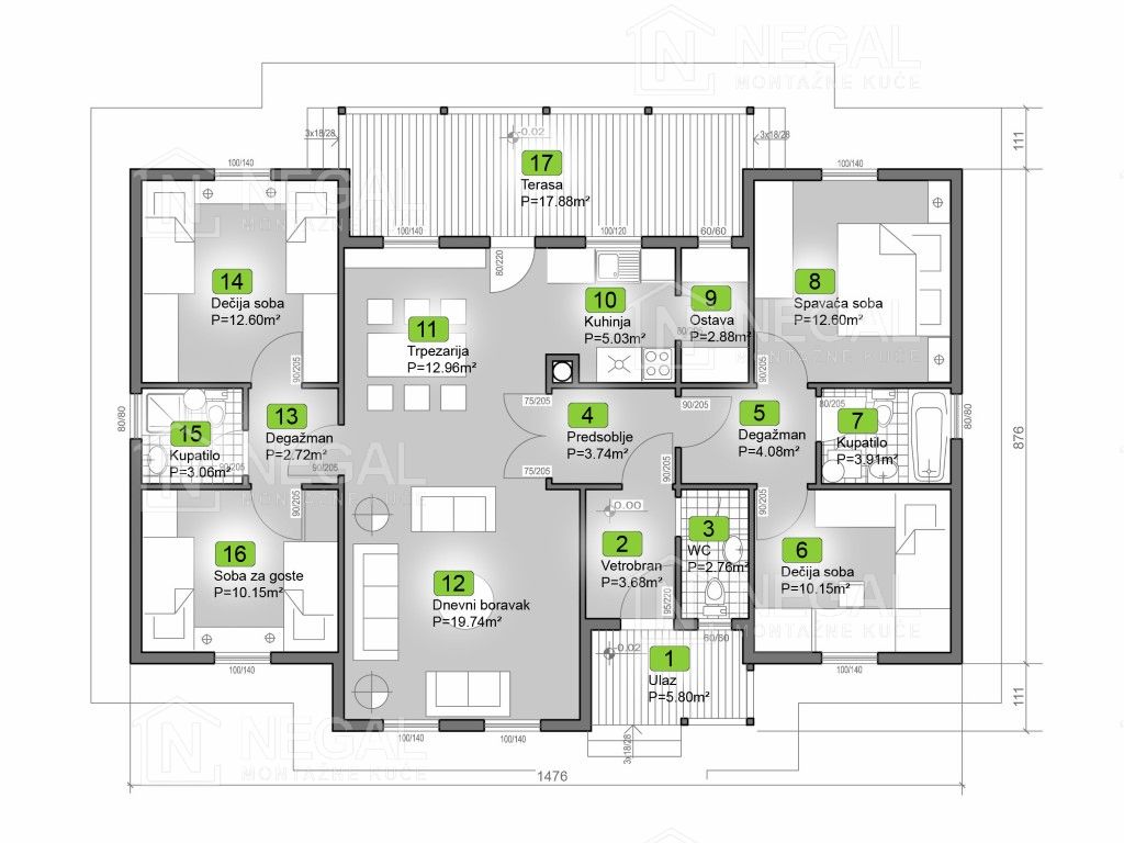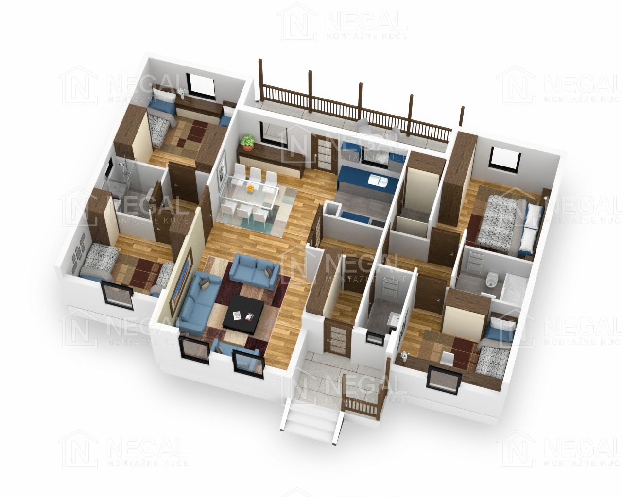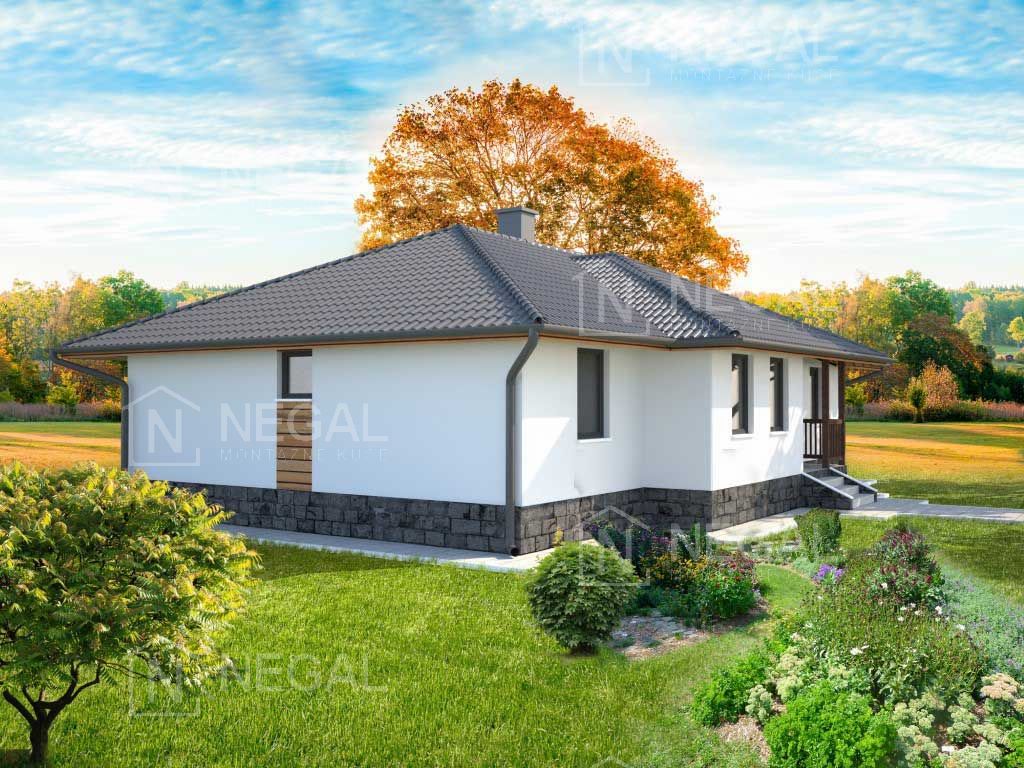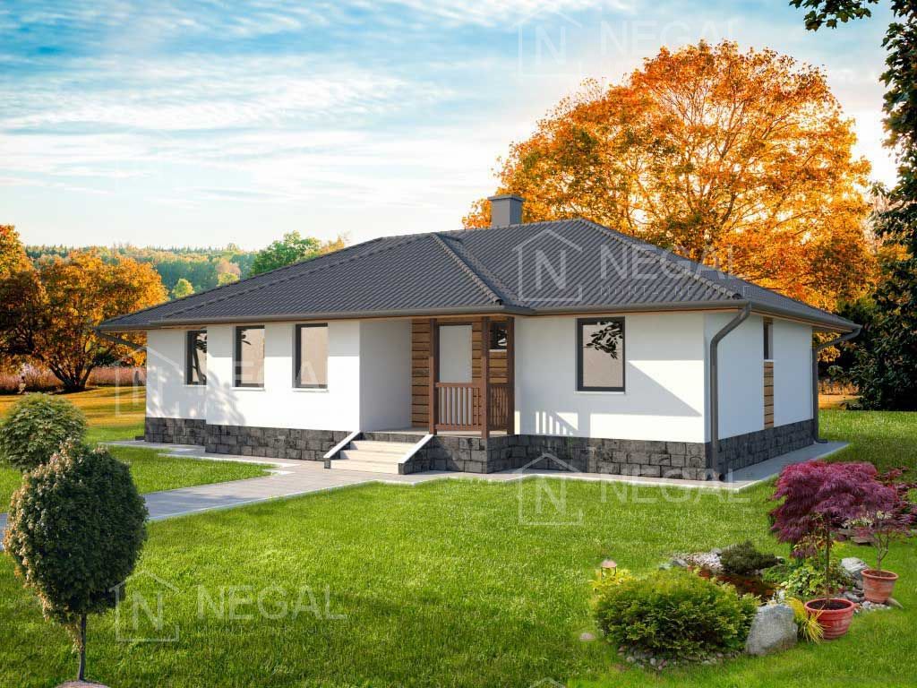 Montažna NEGAL stambena kuća iz kategorije Klasik. Komforna porodična kuća sa tri funkcionalne celine. Kuća je prizemna bez denivelacija sa dimenzijama osnove 14,76 m x 10,98 m. Dve funcionalne celine čine po dve komforne sobe sa obe strane kuće koje preko minimalnog hodnika imaju direktan pristup do nezavisnih kupatila. Središnja celina čini dnevni boravak direktno spojen sa trpezarijom i kuhinjom za osećaj prostranosti. Kuhinja u svom sastavu ima ostavinski prostor za odlaganje kuhinjskog inventara. Ulazni trem je natkriven i nalazi se uz dnevni boravak. Kuća u svom središnjem delu ima i odvojen WC. Trpezarija i kuhinja su direktno spojene preko balkonskih vrata na dosta komfornu terasu koja silazi na zadnji deo dvorišta preko simetričnih stepenica.