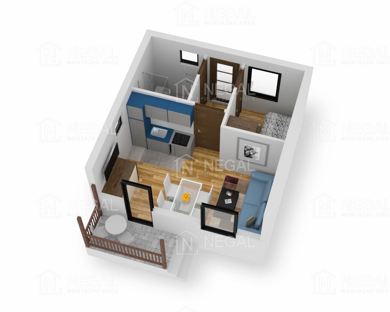 Dnevni boravak ima direktnu vezu sa malom terasom i balkonska vrata koja omogućavaju dosta dnevnog svetla. Kupatilo je malo ali funkcionalno. Ima jedna spavaća soba u kojoj je smešten krevet za jednu osobu.