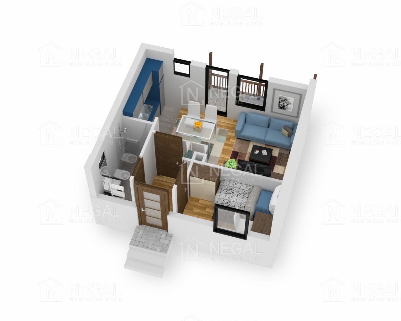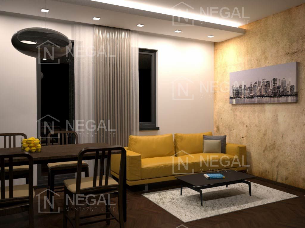 Dnevni boravak je direktno povezan sa terasom gde se nalaze dva prozora i balkonska vrata koji dozvoljavaju dosta dnevnog svetla i sunca unutar njega. Trpezarijski sto se nalazi blizu balkonskih vrata tako da možete ujedno uživati u omiljenom jelu i prirodi. Krov je jednostavan na dve vode uglavnom pokriven sa klasičnim crepom.