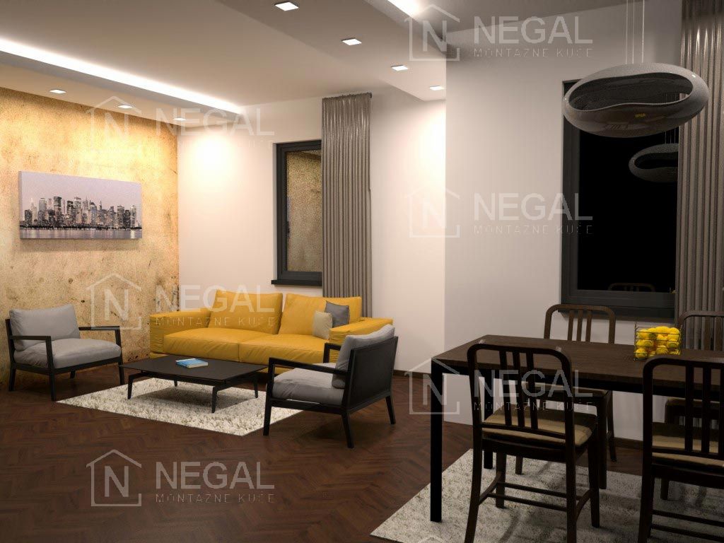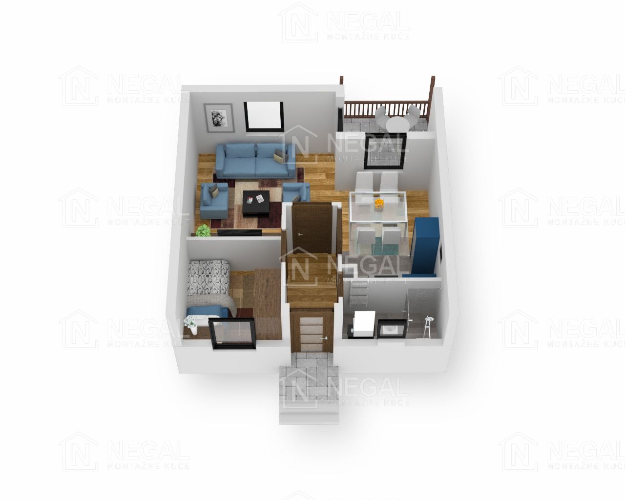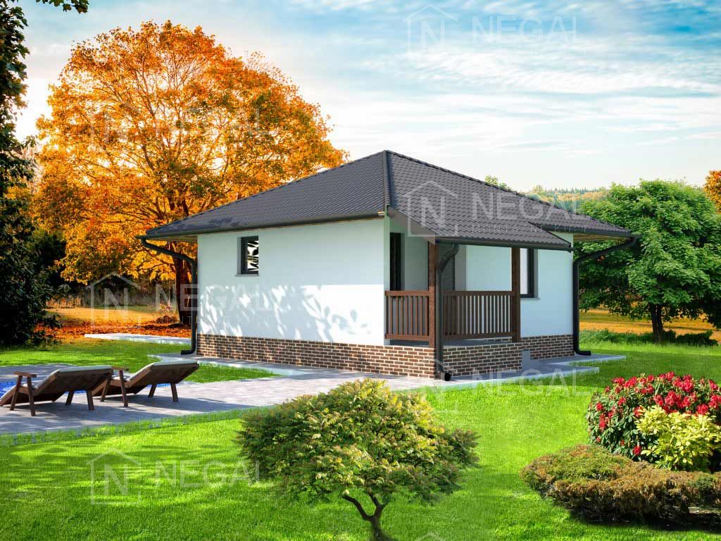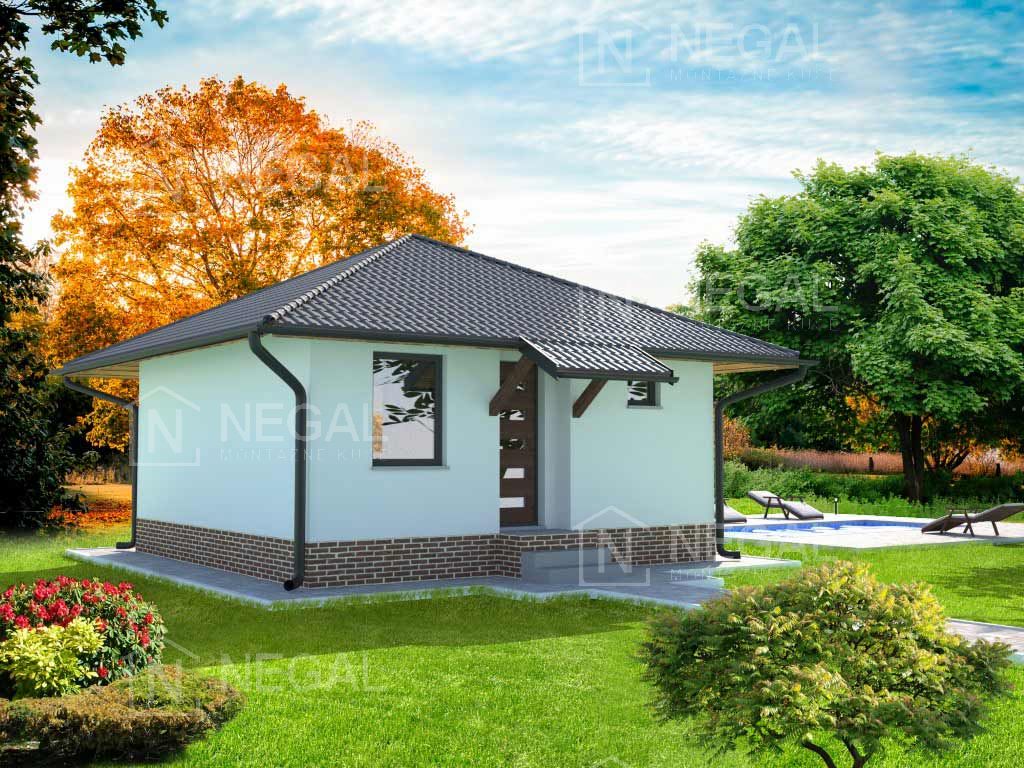 Dnevni boravak je paravanom ili kliznim vratima odvojen od trpezarije i kuhinje. Kupatilo je funkcionalno sa svim potrebnim elementima. Terasa je delom uklopljena u dnevni boravak pa imate osećaj zaštićenosti od spoljnih nepovoljnih uticaja a opet dovoljno velika za komforan boravak na njoj. Krov je na četiri vode pokriven crepom i idealno se slaže u okruženje.