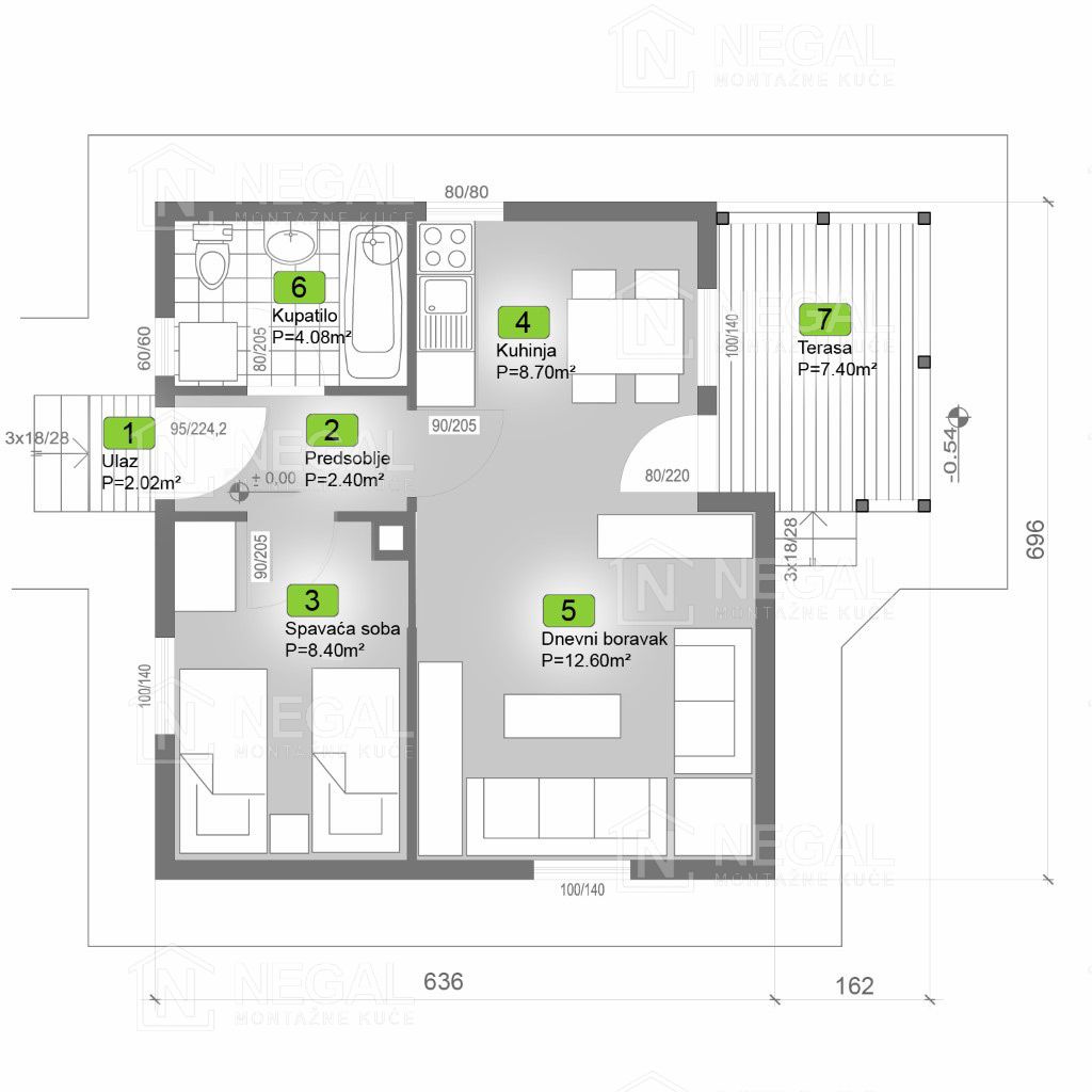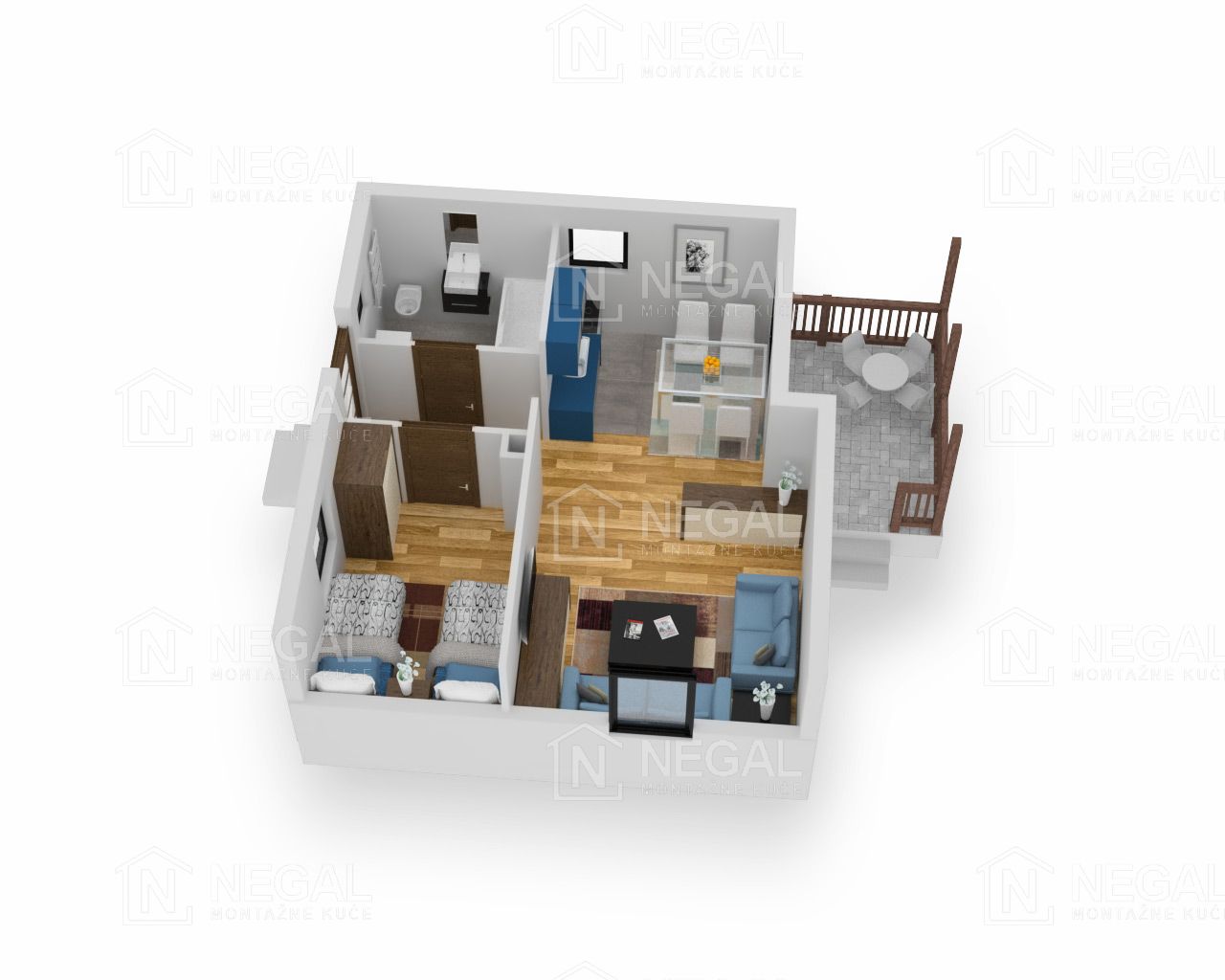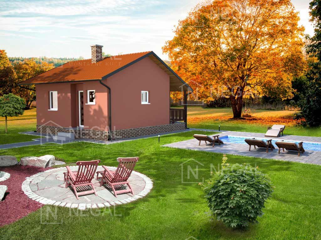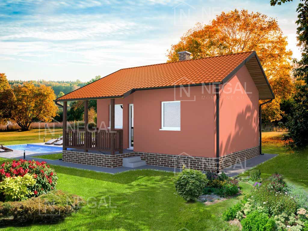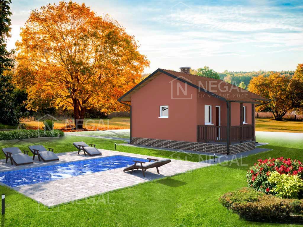 Vikend kuća iz kategorije Klasik. Dimenzija osnove 6,36 m x 6,96 m. Ima jednu veću spavaću sobu i dnevni boravak koji je delimično odvojen od kuhinje i trpezarije. Kupatilo je funkcionalno uklopljeno u celinu. Terasa je delom uklopljena sa trpezarijom i ima direktan silaz u zadnji deo dvorišta. Idealna za porodični odmor preko vikenda. Jednostavne svedene forme sa krovom na dve vode.