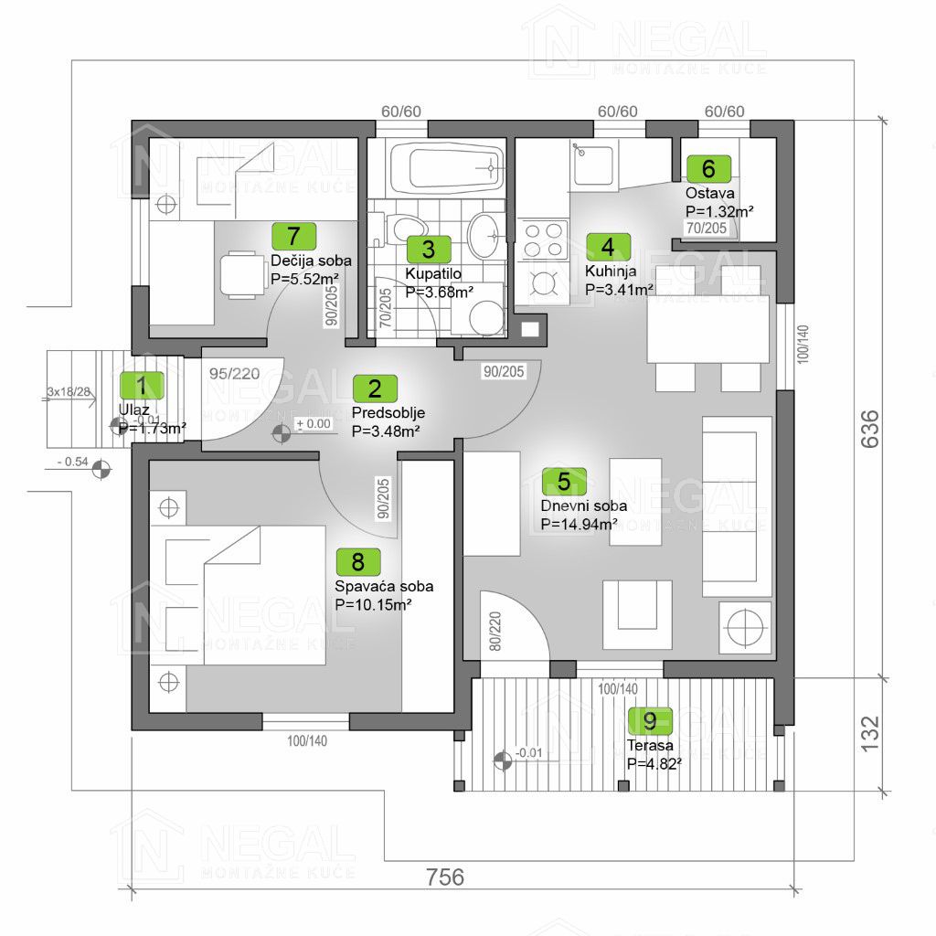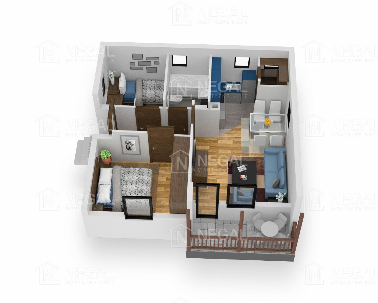 Montažna kuća iz kategorije Klasik. Idealna za stanovanje tročlane porodice jer ima sve potrebne funkcionalne celine a površinom ne zahteva prevelike troškove.