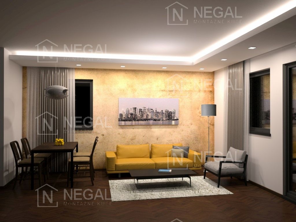 Uz kuhinju postoji ostava za odlaganje kuhinjskog inventara. Dnevna soba koja se nadovezuje na trpezariju ima direktan izlaz na terasu. Sa dva svetla otvora dovoljno sunčeve svetlosti stvara ugodan osećaj u dnevnom boravku. Forma je jednostavna sa krovom na dve vode. Izgled delova fasade možete bojama naglasiti da bi se istake konture.