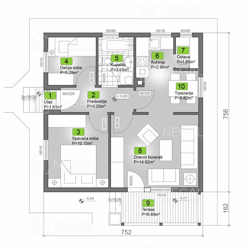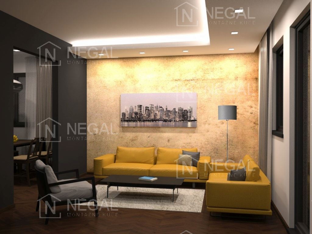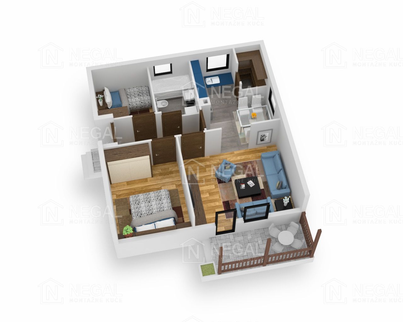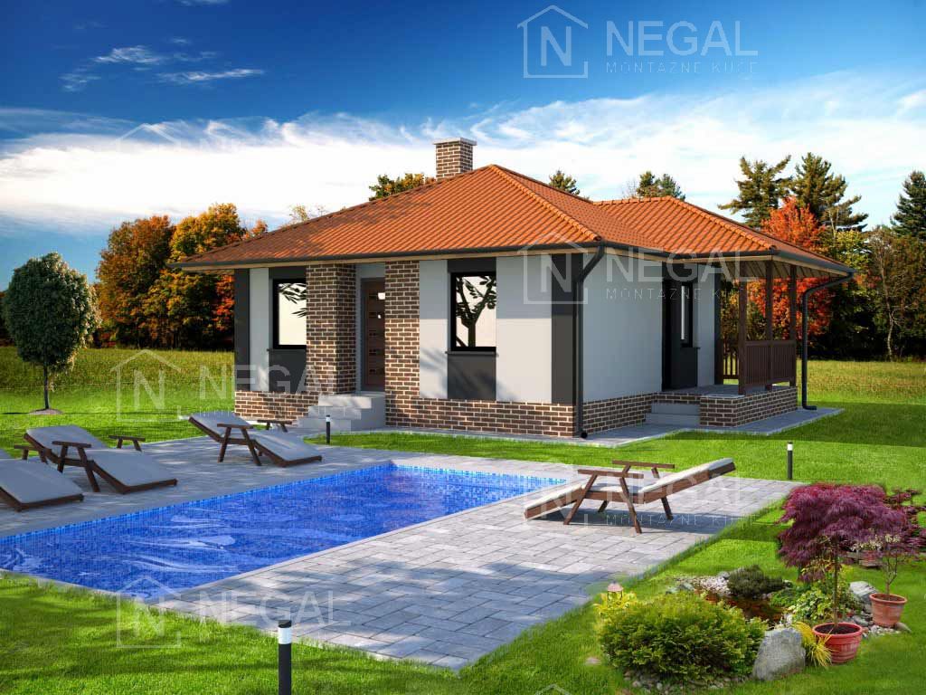 Poseduje dve spavaće sobe. U kuhinjskom delu je ostava gde možete odložiti kuhinjski inventar. Trpezarija je u sklopu kuhinjskog dela i fizički je odvojena od dnevnog boravka. Dnevni boravak je kvadratnog oblika i idealan je za uklapanje nameštaja. Direktnu vezu ostvaruje sa terasom preko balkonskih vrata. Terasa stepenicama ima direktan pristup zadnjem delu dvorišta na kojoj možete odmoriti nakon radova na uređenju dvorišta. Izborom različitih nijansi fasade možete naglasiti ivice i kući dati posebnu estetsku dubinu.