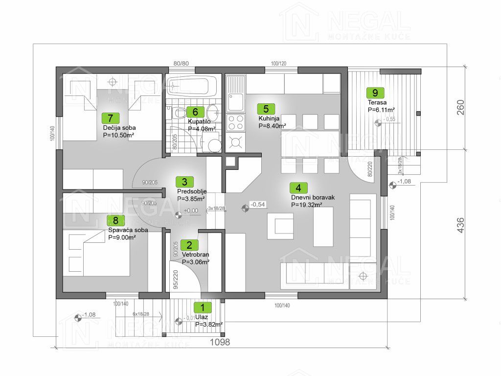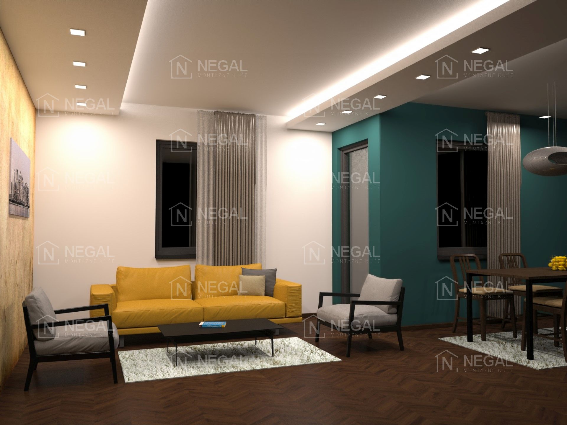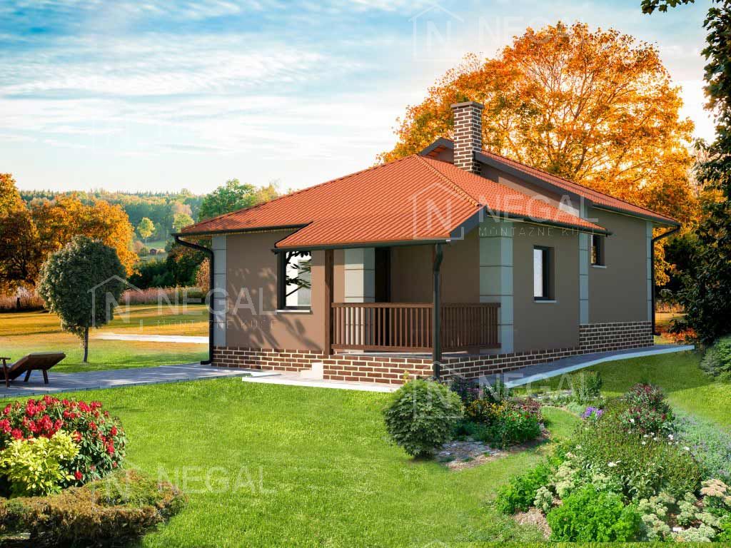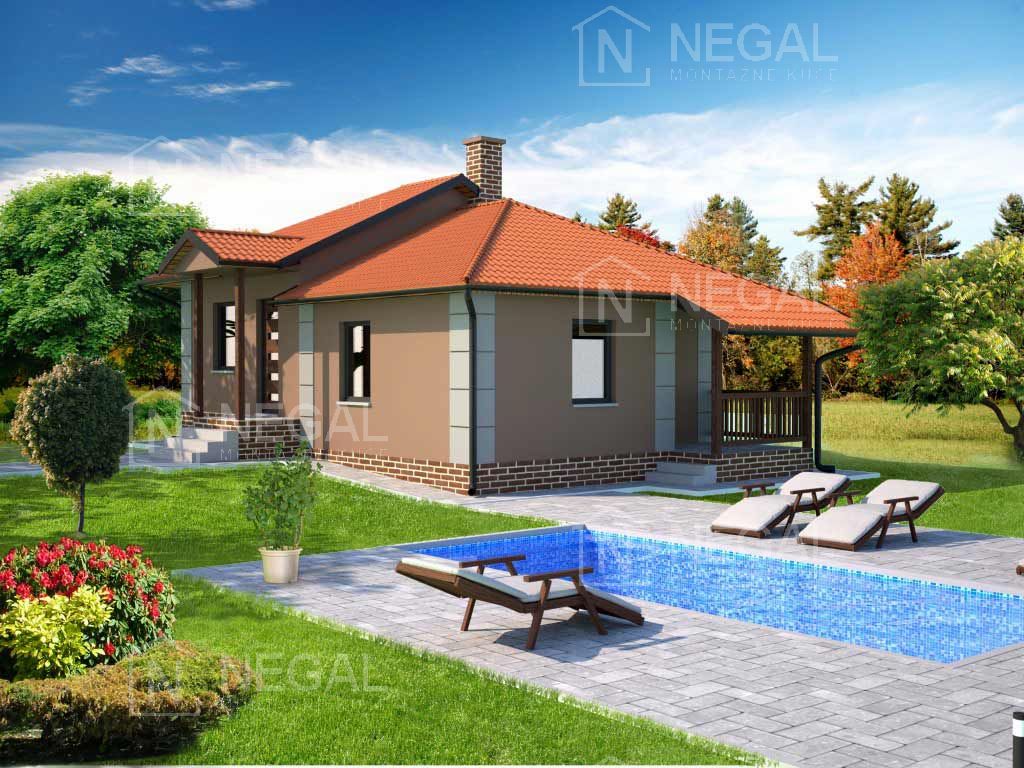 Montažna kuća NEGAL iz kategorije Klasik. Jednostavne svedene forme za komforno stanovanje četvoročlane porodice. Funkcionalno je razdvojena gde su na jednoj strani dve komforne spavaće sobe sa kupatilom, a na drugoj dnevni boravak sa kuhinjom i trpezarijom. Kuhinjski prostor je dosta veliki pa se kuhinja može smestiti u “G“ orijentaciji. Jedna celina od druge je razdvojena hodnikom kao zajedničkom komunikacijom i sa dva stepenika koja prave denivelaciju nivoa a samim tim denivelišu i krov i daju posebnu arhitektonsku dinamiku objektu.