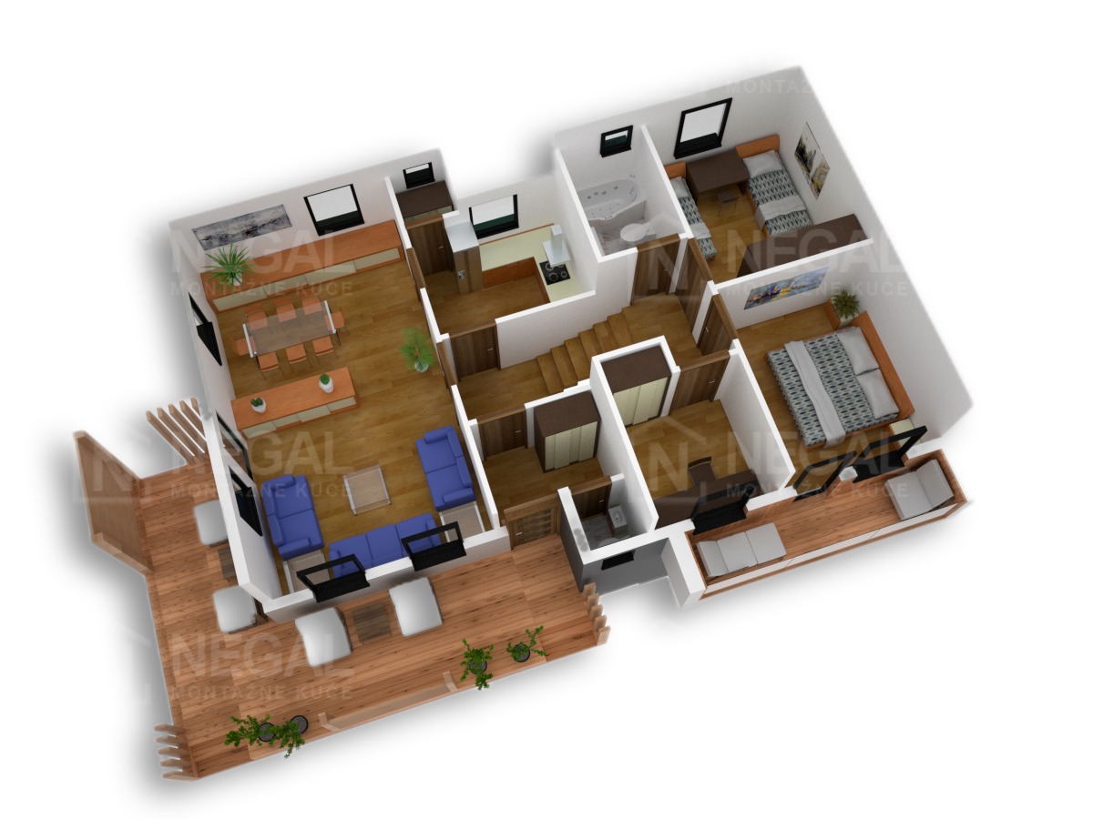 Porodična druženja se lako mogu iz objekta prebaciti na terasu ili dvorište. Terasa komplentno natkrivena sa drvenom opšivkom plafona i drvenim elementima pruža osećaj topline. Viši deo je organizovan sa spavaćim sobama. Dve veoma komforne sobe sa jednom dečijom imaju direktan pristup preko galerije hodnika ka kupatilu. Sobe imaju izlaz na balkon oivičen zidom i naglašen u beloj fasadi dajući mu ton elegancije. Antracit stolarija sa termoizvolvanim staklom daje poseban naglasak konturama otvora. Ispod višeg dela je garaža sa pomoćnim prostorijama i kotlarnicom koje i maju direktu vezu iz kuće za potpuni komfor.