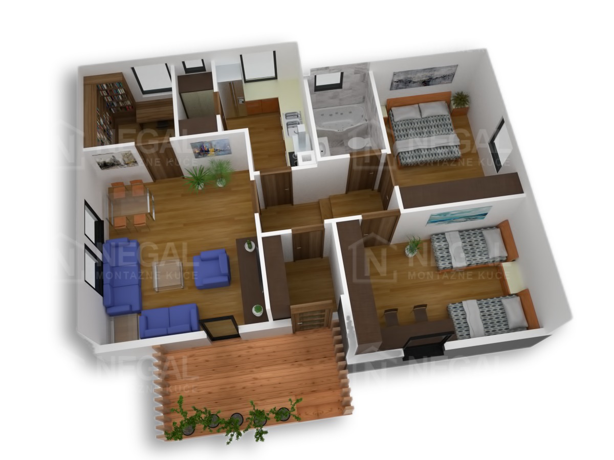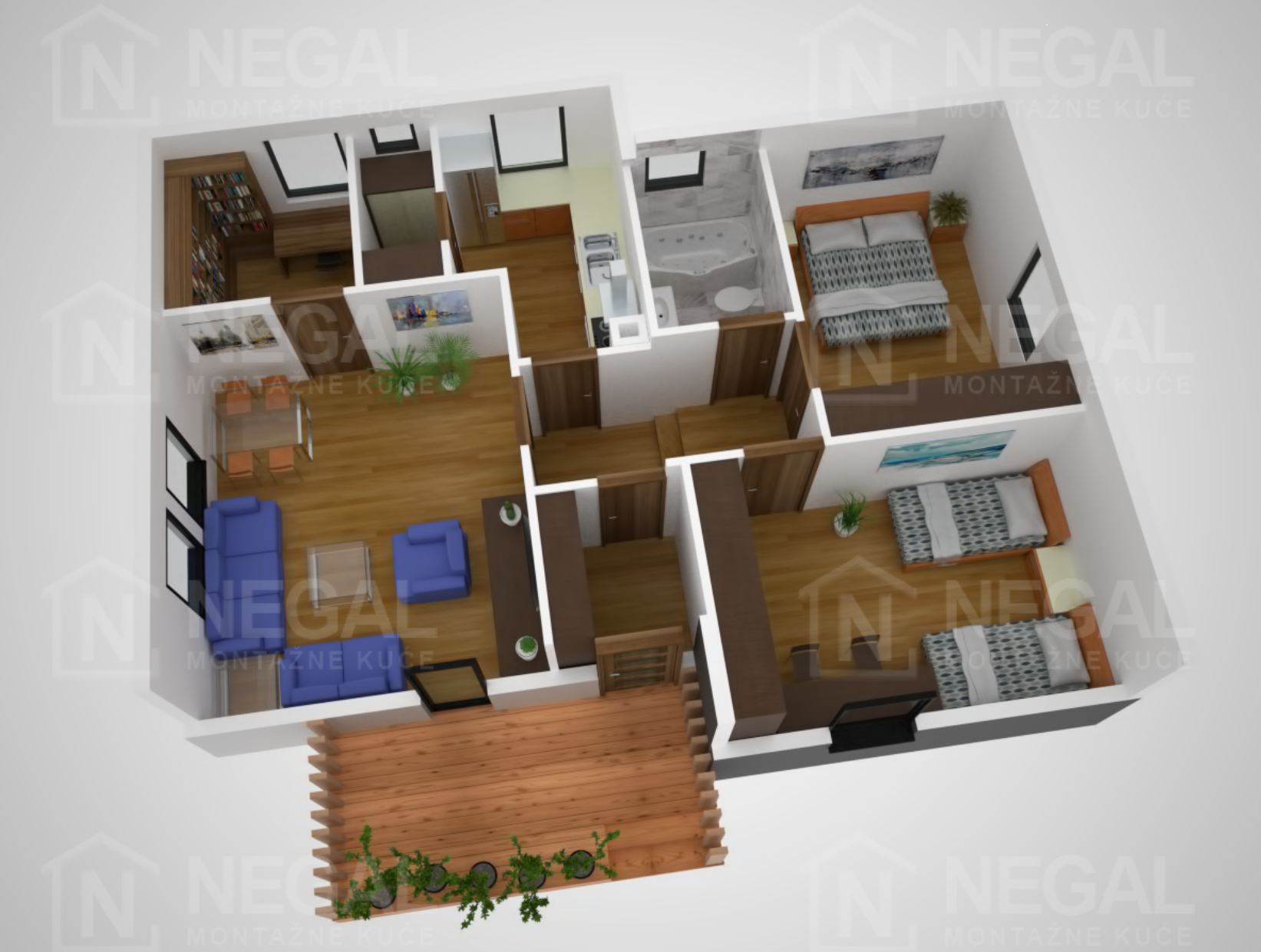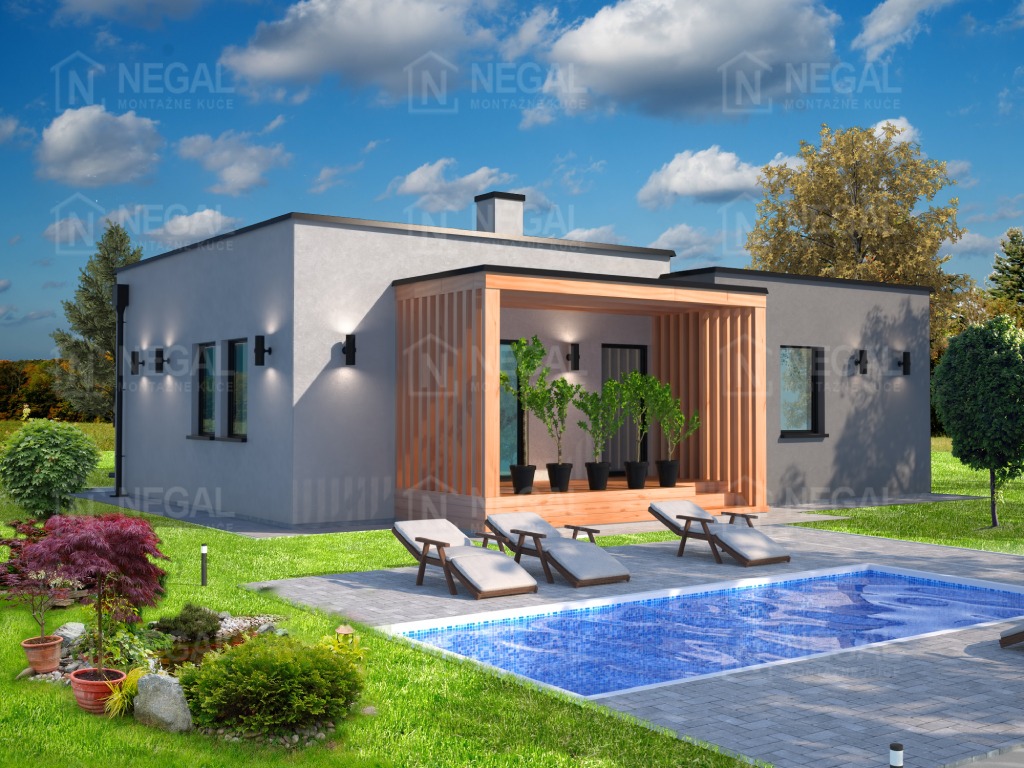 Montažna NEGAL stambena kuća iz kategorije modern. Savremena montažna kuća dizajnirana u modernom stilu sa ravnim krovom. Savremeni prvoklasni i ekološki materijali obezbeđuju niske troškove održavanja. Drvo, kao osnovni konstruktivni elemanat, naglašava ulazni deo i prestavlja spoj moderne arhitekture kuće i prirode.