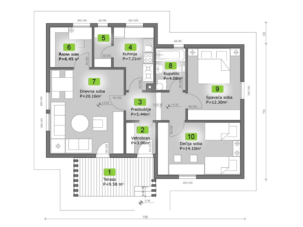 Celina kuće je podeljena na dva dela gde jedan deo je namenjen za odmor kao dve komforne sobe koje su direktno spojene sa kupatilom, i dnevnog dela koji ima direktan izlaz na terasu. U organizaciji objekta isprojektovana je i radna soba, idealna za rad od kuće. Idealna kao vikend kuća za beg u prirodu ili za mlad par sa dvoje dece.